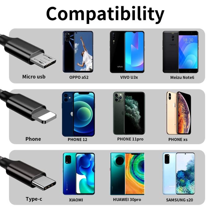 3-in-1 Multi Charging Cable: Includes Micro USB and Type-C connectors, compatible with Android, iOS, and Type-C devices for universal charging. Durable Nylon Braided Design: High-quality, tangle-free nylon braid resists daily wear, providing a sturdy and long-lasting cable. Fast Charging & Data Sync: Supports up to 2.4A output for quick charging and efficient data transfer across all compatible devices. Universal Compatibility: Works with a wide range of devices including iPhone, iPad, Samsung Galaxy, Huawei, Google Pixel, tablets, and power banks.