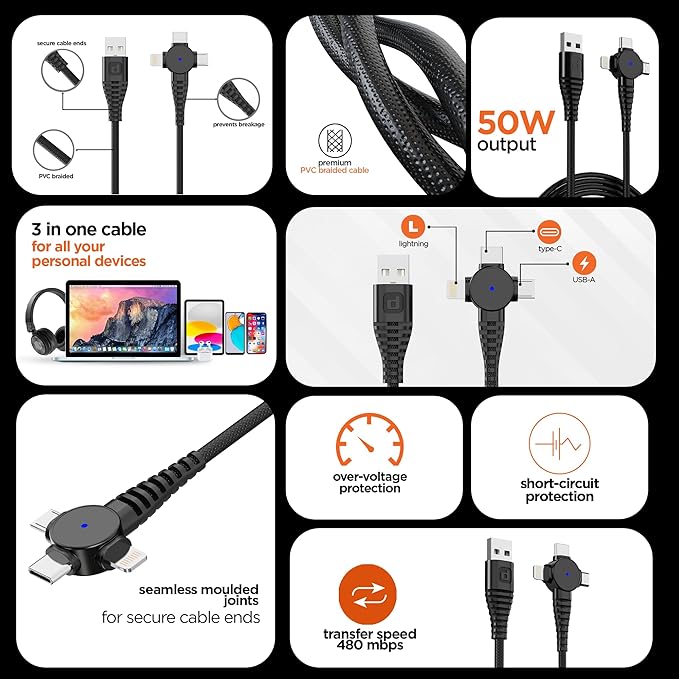 Features over 6k bend life and can withstand up to 10k insertions making it highly durable for all your needs Features blazing-fast 50W charging to super-charge your device in just a few minutes Built-in overheat protection and stable current output leads to protection from overheating, short-circuiting and much more Versatile cable for charging and syncing multiple devices with different connectors Lightweight and compact for you to take it with you anywhere Encased in a high density premium braided wire for a premium finish