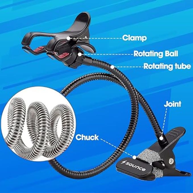The four claws come equipped with anti-slip and anti-shock rubber cushions to keep your cell phone firmly secured. The long gooseneck is highly flexible and adjustable, allowing you to achieve the perfect viewing angle. The 360-degree swivel ball head enables both horizontal and vertical viewing.The robust metal clamp can be adjusted to fit surfaces up to 2.5 inches thick. This makes it ideal for attaching to desks, chairs, tables, beds, kitchen counters, and even in your car. Please remember to coil up the gooseneck when using heavy phones for added stability.