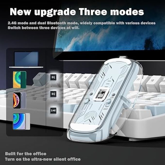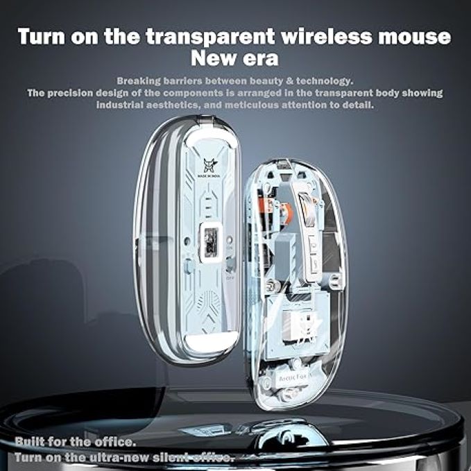 BUILT IN RECHARGEABLE BATTERY :: The AF transparent mouse features a built in high-performance rechargeable 400 mAh battery, providing an impressive 30 days of usage on a full charge. The automatic hibernation mode minimizes power consumption, effortlessly awakening with a simple button click. BATTERY LEVEL DISPLAY :: The Real Time 4 grid power display allows you to effortlessly monitor the battery levels during use. 4 ADJUSTABLE DPI :: Experience precise and swift tracking with our optical gaming mouse, featuring 4 adjustable DPI levels (800/1200/1600/2400). Suitable for all mouse mats, it ensures high sensitivity and accuracy for both office and gaming use. BOSS KEY :: Effortlessly switch to the desktop with a single click using the "Boss Key," enhancing office efficiency and ensuring privacy. (Not compatible with Mac OS) ERGONOMIC DESIGN :: This ultra-light mouse is designed to seamlessly fit the palm of your hand, ensuring a comfortable and effortless feel.